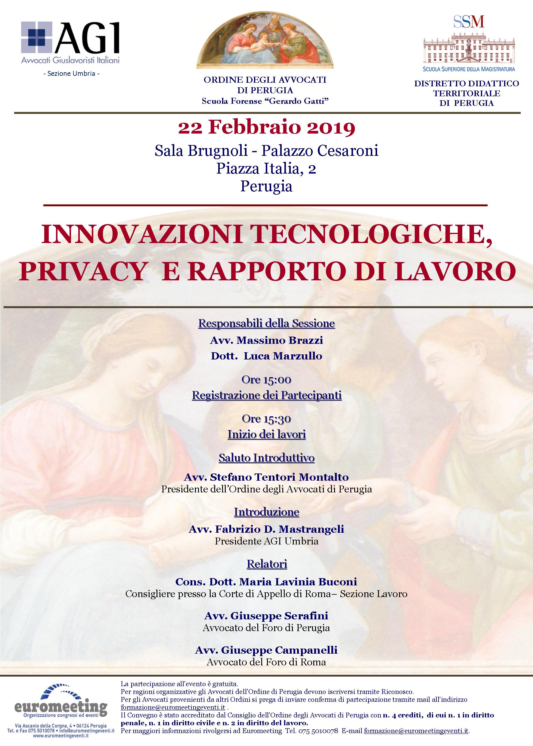 Evento Formativo organizzato dall'Ordine degli Avvocati di Perugia Scuola Forense "Gerardo Gatti" con la collaborazione della Scuola Superiore della Magistratura - Distretto Didattico Territoriale di Perugia e con la collaborazione di AGI - Avvocati Giuslavoristi Italiani - Sezione Umbria.
