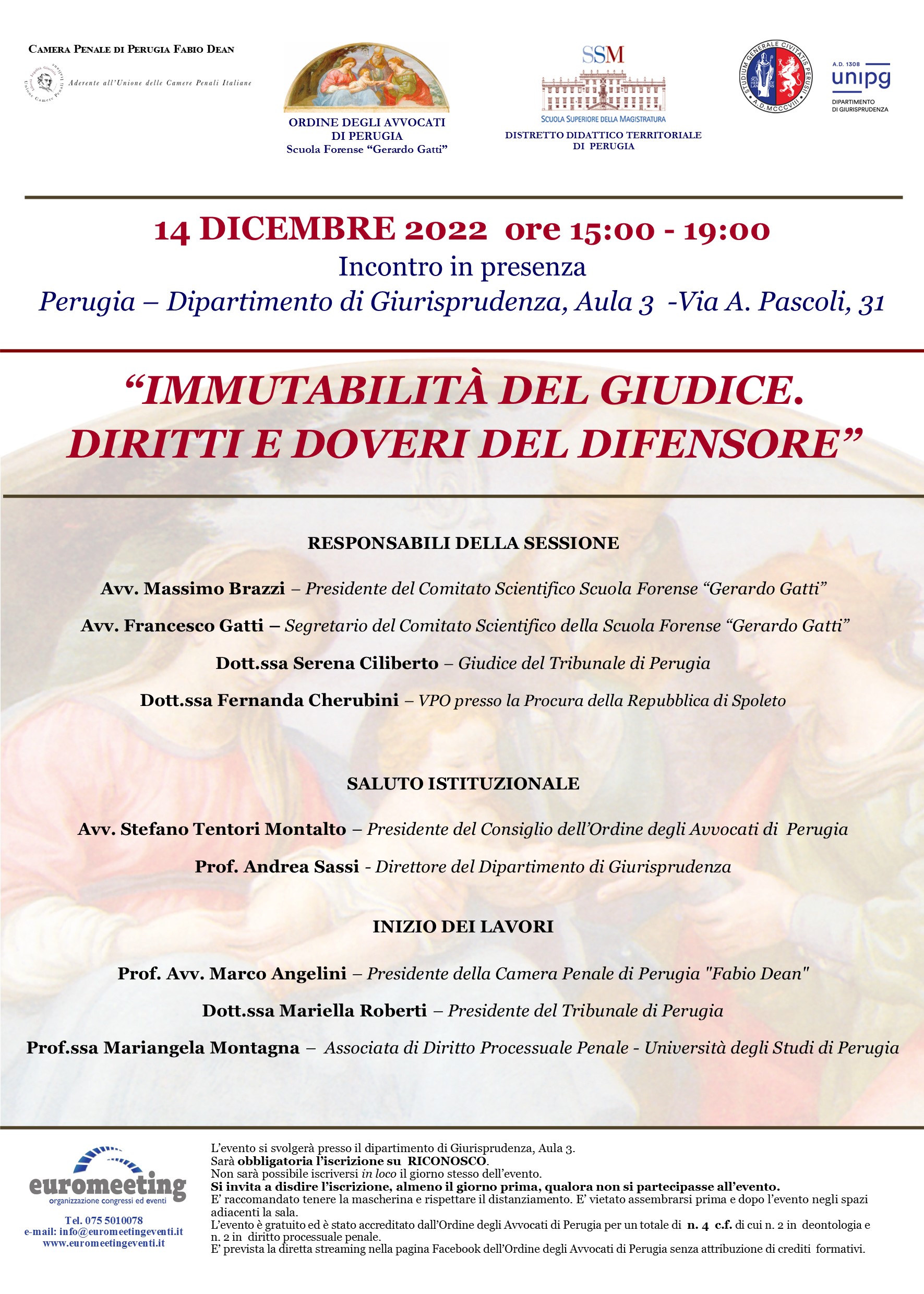 L’evento è gratuito ed è stato accreditato dall’Ordine degli Avvocati di Perugia per un totale di n. 4 c.f. di cui n. 2 in deontologia e n. 2 in diritto processuale penale.